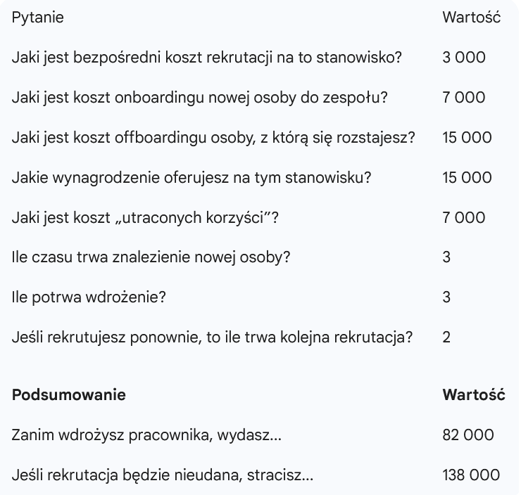 Zdajesz sobie sprawę, że jeśli nie masz strategii rekrutacyjnej, brakuje Ci procesu onboardingu i offboardingu, to koszty wskazane w przykładzie będziesz mnożyć, szczególnie kiedy rekrutacji w roku jest więcej niż jedna.