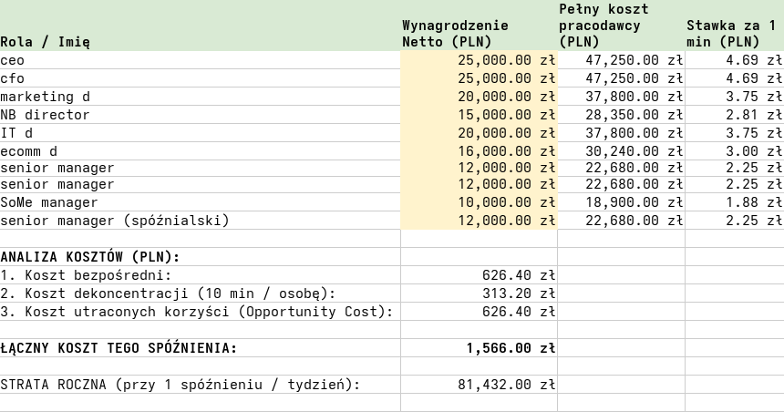 - Czy wiecie, że firmy, które nie liczą tego kosztu, nieświadomie budują kulturę, w której 10 minut spóźnienia jest normą, co de facto skraca tydzień pracy o około 2-3 godziny na pracownika.